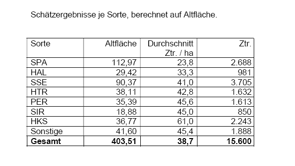 Die Bundesschätzkommission hat - verstärkt durch regionale Experten - im Sinne guter Markttransparenz auch 2020 wieder die kommende Ernte in den süddeutschen Anbaugebieten prognostiziert. In Spalt geschah dies am 20.8.2020. Die Anbaufläche des Jahres 2020 betrug mit 407,7 ha gut sieben ha weniger als 2019. Davon waren 4,13 ha Junghopfen, der keinen oder zumindest keinen vollen Ertrag erwarten läßt. Die Kommission schätzte einen Gesamtertrag von 780 to. 2019 hatte sie 618 to geschätzt. Eine Schätzung, die von der tatsächlichen Ernte mit 707 to deutlich übertroffen wurde. Die wichtigsten Sorten Spalt Spalter wurden hier für 2020 mit 135 to und Spalt Spalter Select mit 183 to mit überdurchschnittlichen Erträgen eingeschätzt. Im Ganzen ist die Erwartung bezüglich der Menge überdurchschnittlich und angesichts der sehr gesunden Bestände bezüglich der Qualität hervorragend. Der Spalter Hopfen wird aktuell von 51 Betrieben angebaut. Das ist einer weniger als im Vorjahr.