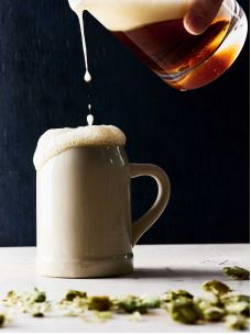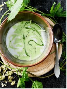 Das Bier in einen Topf geben und den Alkohol verdampfen lassen, Brühe und Sahne hinzugeben. Die Stärke in wenig kaltem Wasser klümpchenfrei anrühren und in die Flüssigkeit einrühren. Unter gelegentlichem Rühren aufkochen lassen. Die Velouté vom Herd nehmen. Hopfensprossen von der dünnen Schale befreien, dafür am besten Salz in die Handfläche geben und die Sprossen vorsichtig zwischen den Händen reiben. Anschließend unter fließendem Wasser abwaschen und abtropfen lassen. Dann die Sprossen zusammen mit dem Wildspargel in Butter anschwitzen und den Zucker hinzugeben. Die Kräuterbutter in die Velouté einmixen und die Suppe mit Salz und Pfeffer abschmecken. Das Gemüse auf Teller verteilen und die Suppe daraufgießen.