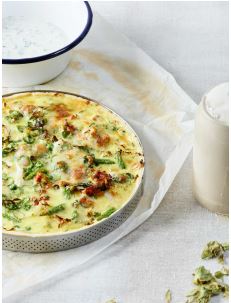 Den Speck in einer Pfanne anbraten, Hopfensprossen, Estragon und Frühlingslauch hinzugeben und kurz mitdünsten. Sahne mit Sauerrahm, Eiern, Käse, Zitrone und Gewürzen vermengen. Den Inhalt der Pfanne auf dem vorgebackenen Teig verteilen und mit der Sahne-Ei-Masse übergießen. Im vorgeheizten Ofen bei 140 °C für 35 Minuten backen.